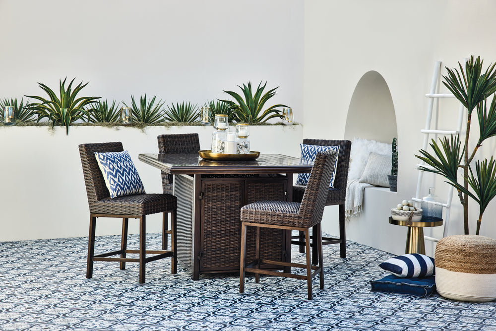 Turn your backyard space into your own piece of paradise with the Paradise Trail outdoor table with fire pit. Though this outdoor table looks remarkably like wood, it’s made of sturdy, rust-proof aluminum that’s perfectly suited for alfresco living. Enhancing the rustically refined aesthetic: side panels accented with all-weather, handwoven resin wicker. The result may look high maintenance, but rest assured, this outdoor fire pit table is anything but. With the press of a button, ignite a flickering flame that dances over a bed of glass beads. And with room for up to eight, it’s one highly accommodating outdoor bar table.